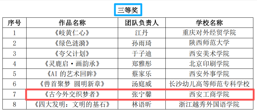 此次获奖不仅体现了我校在AIGC内容创作与跨学科实践教学方面的成果,也展示了人文学院师生团队扎实的专业素养和创新能力。未来,西安工商学院人文学院将继续以赛事为牵引,深化与行业的对接合作,推动 AIGC、数字文创等新兴领域的教学创新,为文化传播事业培育更多理论基础实、综合素质优、应用能力强,具备人文精神、国际视野、创新意识,职业能力优秀的高素质应用型人才。