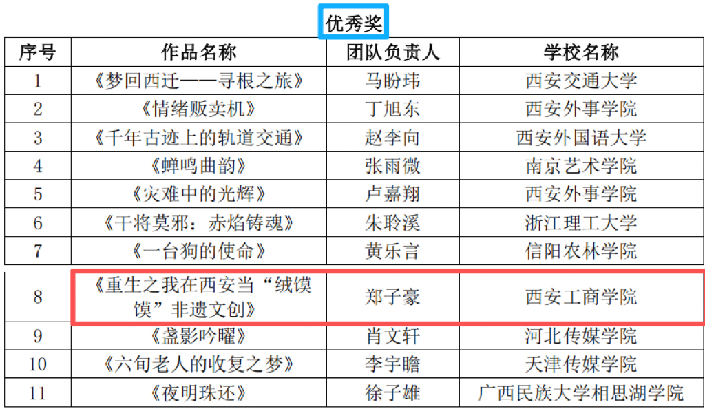 另一部获奖作品《重生之我在西安当绒馍馍“非遗文创”》由李雨桐、师湘茹老师指导,郑子豪同学创作。影片以陕西省非遗文创产品“绒馍馍”为主线,通过拟人化叙事,讲述其从传统小吃到文化符号的蜕变过程,折射出西安深厚的历史文化底蕴和文创产业的蓬勃活力,带动更多人关注非遗、走进西安、传播文化。