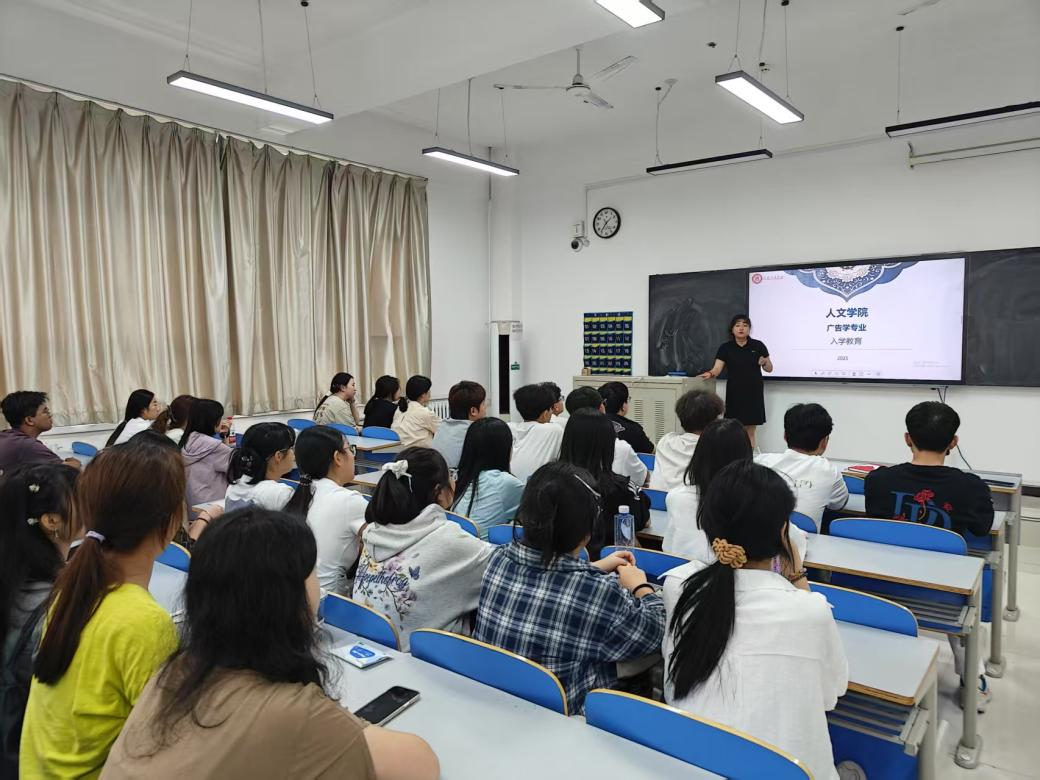 为帮助广告学专业本科新生尽快适应校园生活,深入了解专业内涵,明确学习方向,激发对广告学专业的热爱与探索精神。人文学院广告设计系于9月3日下午在教2楼2-305举办2025级广告学专业本科新生入学教育活动。会议由人文学院广告设计系主任罗曼主持,全体广告学专业教师及2025级本科新生参与了此次会议。