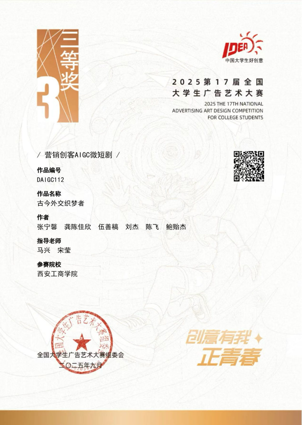 营销创客AIGC微短剧类:作品《古今外交织梦者》由张宁馨、龚陈佳欣、伍善稿、刘杰、陈飞、鲍贻杰同学创作,新闻传播系马兴、宋莹老师指导,荣获国家级三等奖;郑子豪同学作品,由新闻传播系教师李雨桐、师湘茹老师指导,荣获全国三等奖。