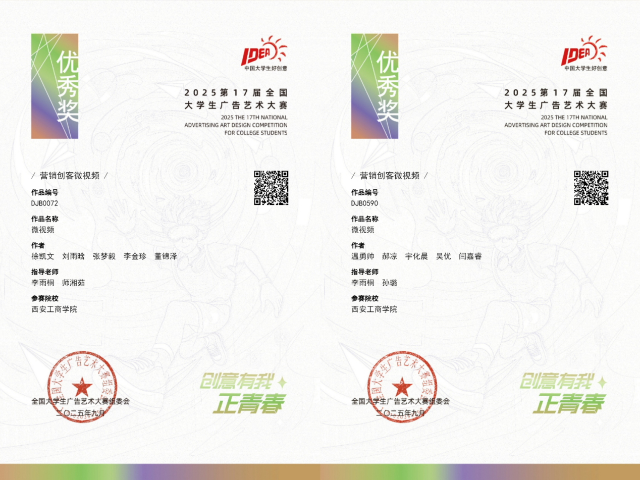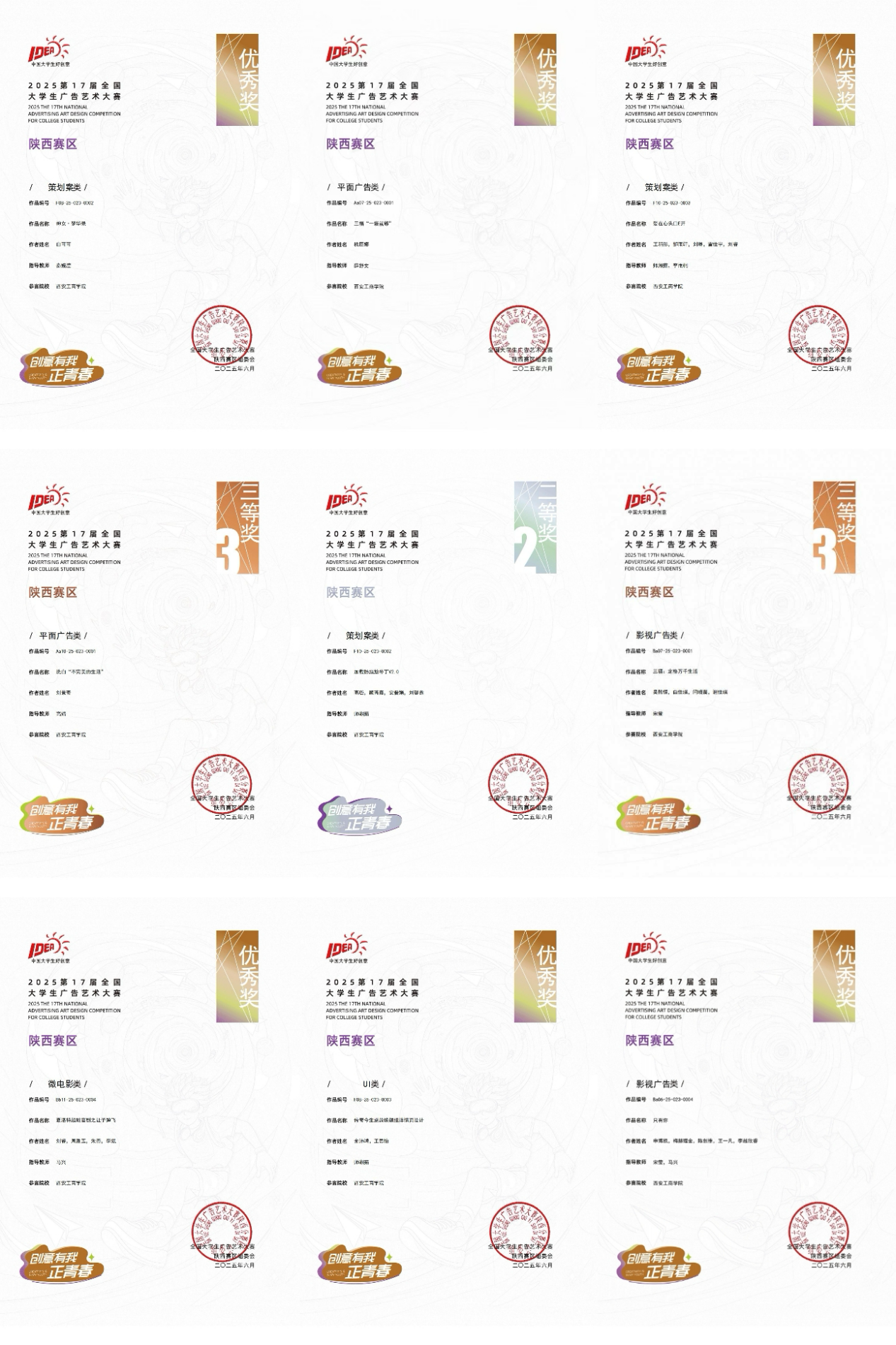 此外,在本届大广赛陕西赛区中,我院学子同样表现亮眼,共获省级奖项9项,涵盖策划案、平面广告、影视广告、微电影等多个类别,全面展现了我院在人文教育与创作实践中的扎实成果。具体获奖情况如下: