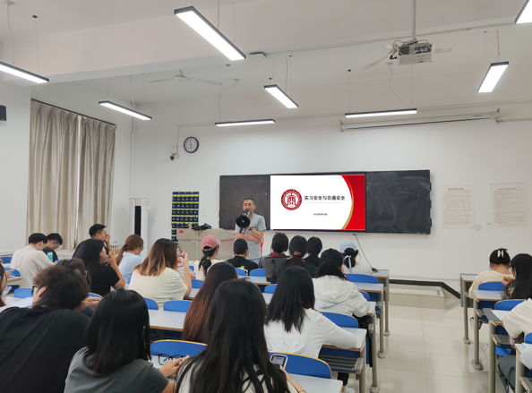 在人身安全方面,胡潇元老师提醒同学们在实习工作中要严格遵守实习单位安全制度,避免意外和事故的发生;定期与父母、学校保持联系,保证通讯畅通。在财产安全上,告诫同学们乘车时不要打盹、睡觉,以免发生财产安全事故;下车时仔细清点行李物品,不要遗失或拿错;拒绝任何以实习费、培训费、风险抵押金等理由的收费行为。