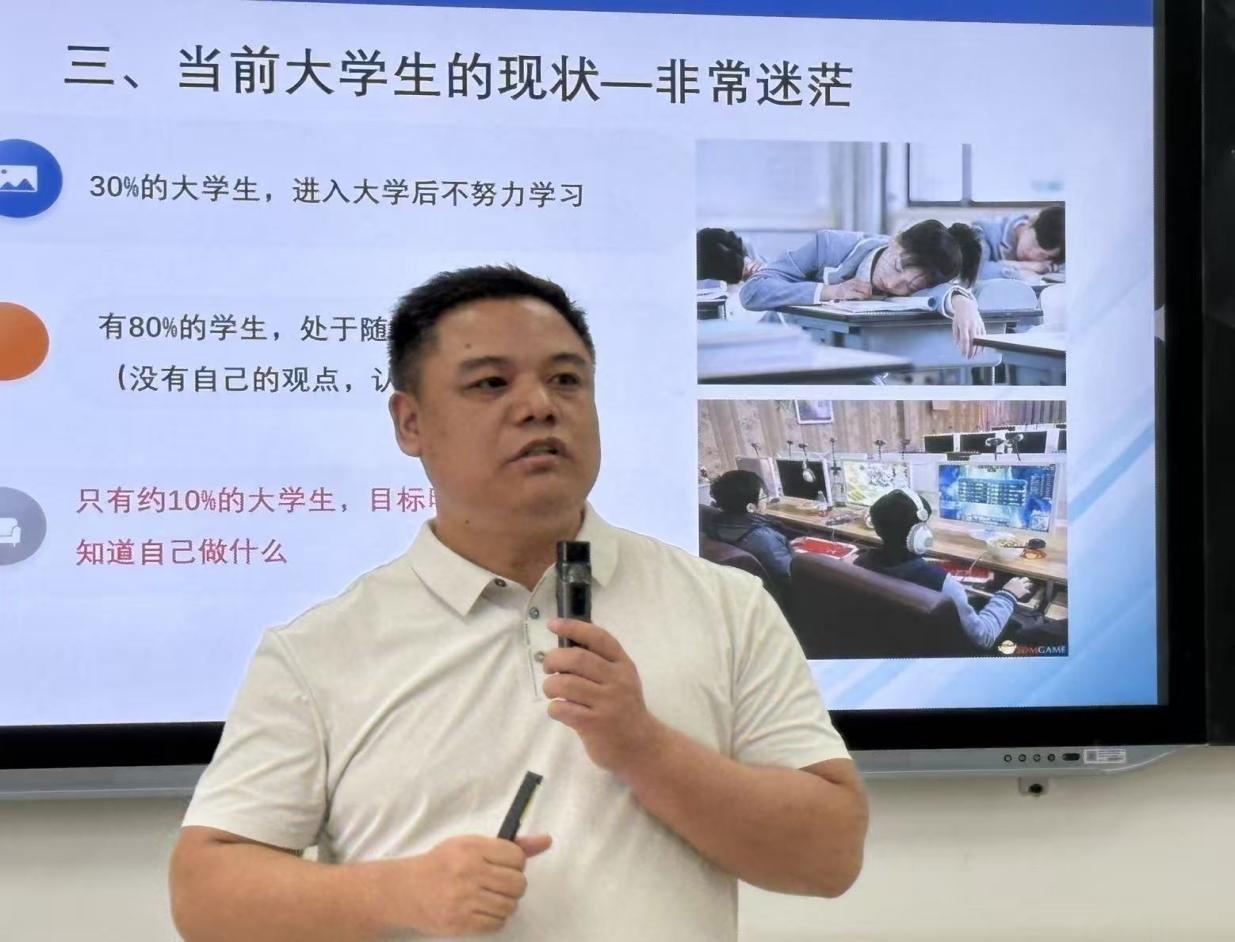 他进一步分析了当前就业形势与大学生普遍存在的迷茫状态,面对经济下行、岗位缩减的现实,他呼吁新生“尽早明确目标,避免随波逐流”。针对中文专业特点,陈教授详细阐述了就业、考研、考公等多元路径的选择策略,强调“职业目标决定行动方向”,鼓励学生结合自身兴趣与行业趋势,制定四年目标与十年规划。