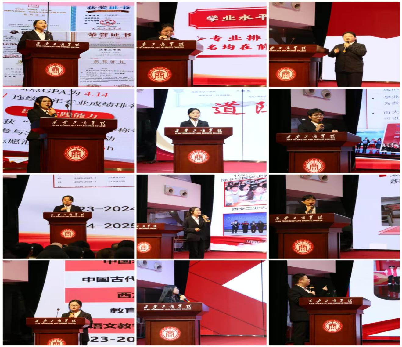 经个人申报、班级推荐、学院初审等环节,本次共有11名本科生、7名专科生进入答辩环节。答辩过程中,候选人以PPT汇报的形式,展示了自己在技能竞赛中的获奖经历、同时分享了担任学生干部、组织文化主题活动的经验,展现出扎实的学术功底与全面的综合能力,部分学生还现场分享了参与社区文化服务、非遗传承宣传等志愿活动的感悟,将专业知识与社会需求紧密结合。