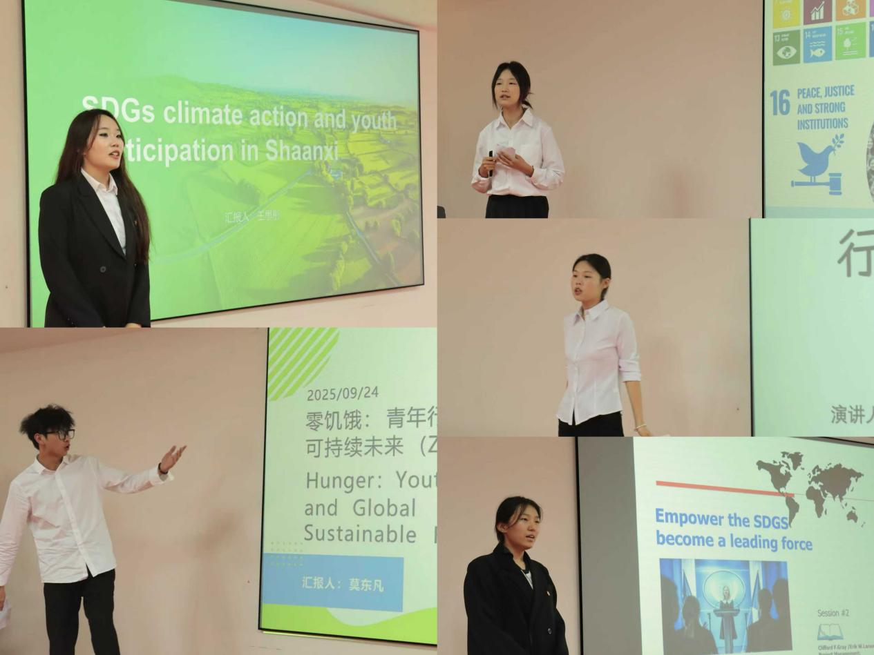 接下来主持人宣布比赛开始。来自不同专业的学子们化身国际议题的“青春发言人”,以可持续发展目标(SDGs)为主题展开个人内容论述,涉及气候行动、教育公平、生态保护、社区赋能、性别平等、社会发展等多个方向,以国际化视角的内容表达展示人文学院学子青春风采和个人力量。同时,英语作为本次比赛指定的交流语言,不仅起到传递信息的作用,还成为展现选手议题表达能力的重要方式,同时也展现出选手在议题理解、语言运用以及临场反应等方面的综合能力。