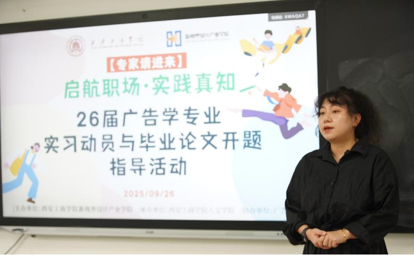 为助力广告学专业2026届毕业生明确实习与毕业论文开题要求,提升职场竞争力与论文写作能力。 9月26日上午,在西安工商学院新视界设计产业学院的组织下,人文学院广告设计系在校内教1楼301教室举办了“启航职场,实践真知——实习动员与毕业论文开题专题指导活动”。活动聚焦毕业生实习与论文写作关键需求,通过多环节精准指导,为毕业生搭建起从校园到职场、从理论到实践的桥梁。