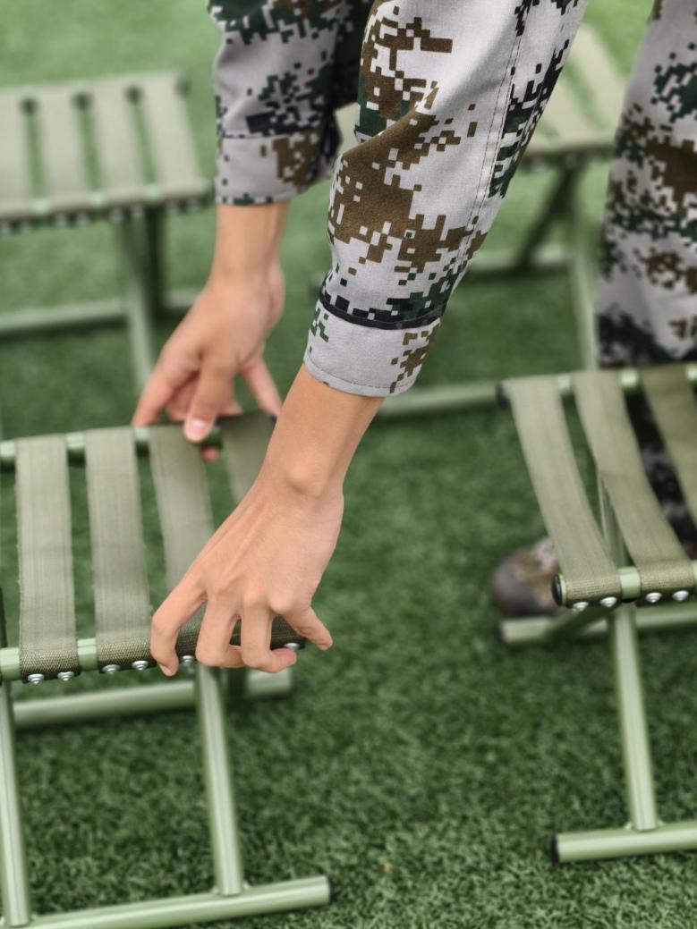 休息区的马扎,更成了独属于病号连的“战场”。大部队离开后,地上的小马扎总是歪歪扭扭散落在各地,而他们就在集合后弯下腰把马扎一一整理好,摆成一条笔直的线。大家蹲在地上,像是机枪瞄准一般,一丝不苟地将所有马扎摆放地横平竖直。这份藏在细节里的纪律,让大家明白军训的纪律性、严谨性早已在不知不觉中刻进了他们所有人的心里。