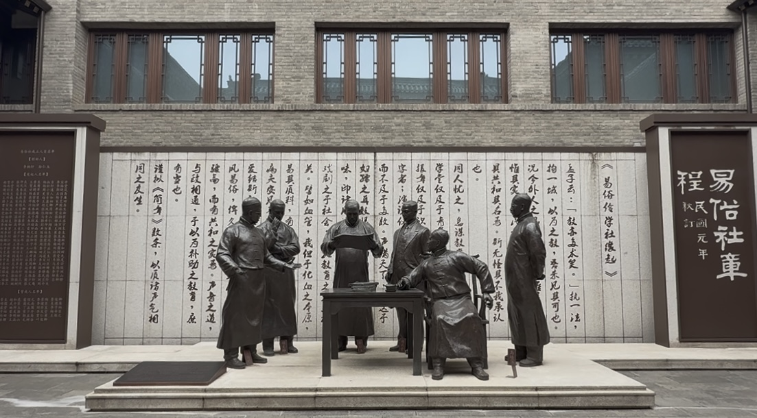 在易俗社创始人雕塑群前,同学们驻足良久。这些铜像生动还原了先辈们研讨戏曲改良的场景,背景墙上的《易俗社章程》节选,让大家直观感受到百年剧社“移风易俗、启迪民智”的创办初心。