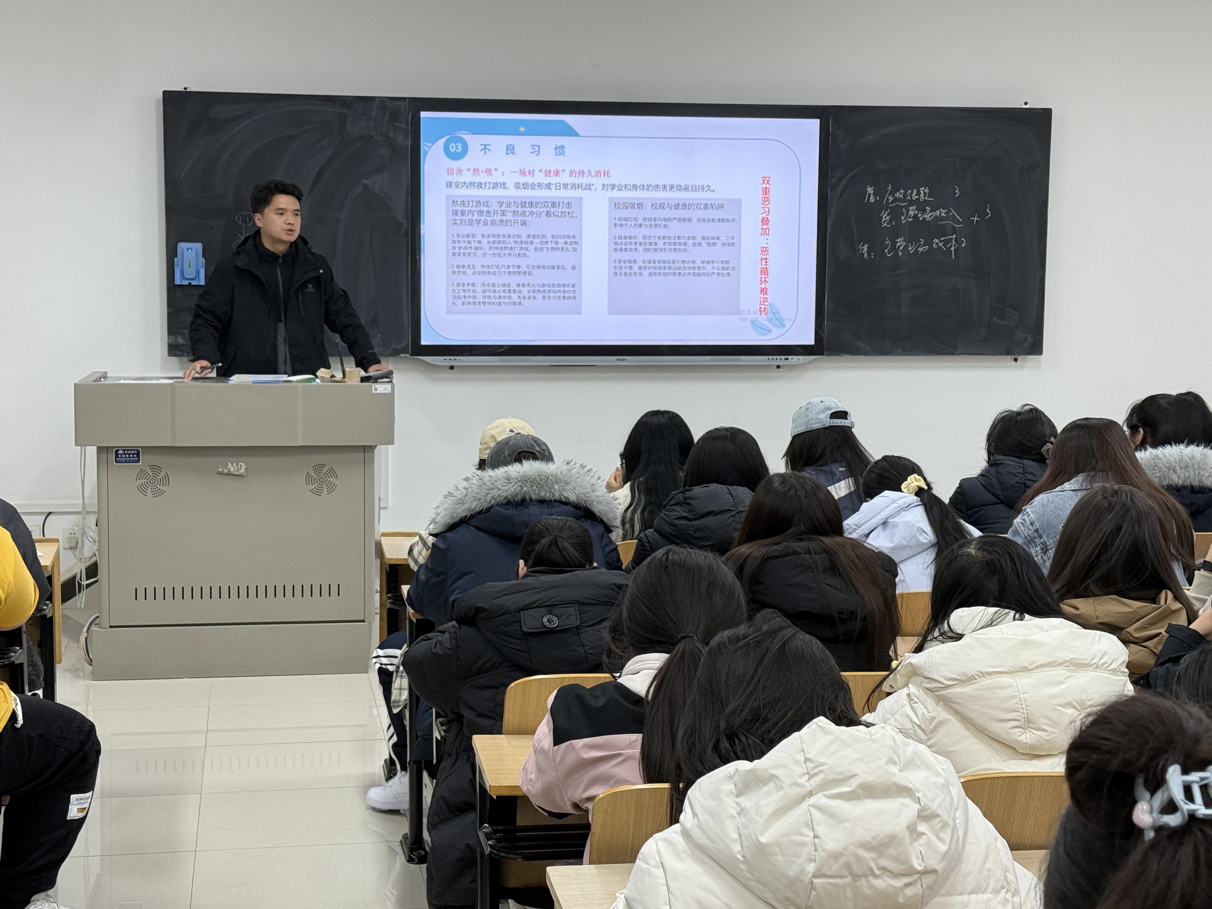 针对如何远离不良习惯、培养好习惯,辅导员从生活、卫生、学习三个维度给出具体指引:生活上,建议学生制定作息公约、用运动社交替代“室内开黑”;卫生上,号召人人争当“宿舍卫生监督员”,共同维护整洁环境;学习上,提出“提前预习、专心听讲、不拖沓、勤动笔”等6项核心习惯。