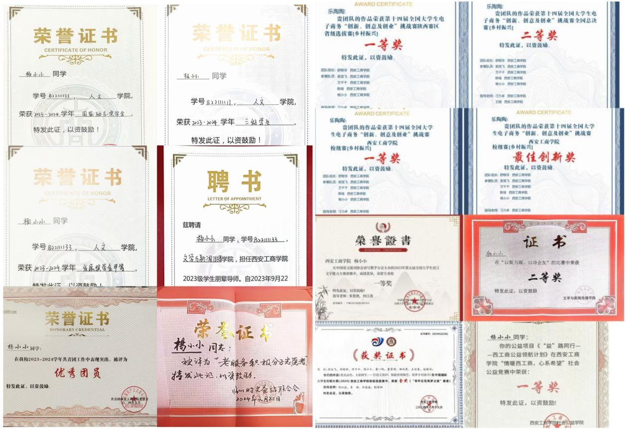 个人简介:中共党员,人文学院汉语言文学专业22级学生,B221111班学习委员。连续三年专业成绩稳居年级前10%,多次获国家励志奖学金、发展奖等荣誉,获评“三好学生”“优秀团员”。竞赛中斩获全国大学生语言文字能力大赛初赛一等奖、电商“三创”挑战赛全国总决赛二等奖等多项荣誉,公益项目获校级社会公益竞赛一等奖。同时担任新生朋辈导师,获评“为老服务积极分子志愿者”,积极投身志愿服务与校园实践。