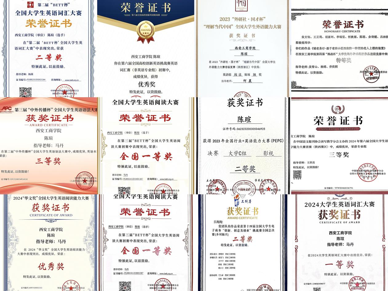 个人简介:中共预备党员,人文学院汉语言文学专业22级学生。连续三年获甲等奖学金及“三好学生”称号,双语能力突出,获“外研社·国才杯”省级铜奖、全国大学生英语阅读大赛一等奖。创新创业类竞赛表现亮眼,带领团队获电商“三创”挑战赛全国二等奖、中国国际大学生创新大赛校级金奖等,还获全国大学生语言文字能力大赛三等奖,深度融合专业知识与实践创新。陈瑄以竞赛为纽带,将专业知识与实践创新深度融合,生动诠释了“以赛促学、以赛促练”的成长理念。