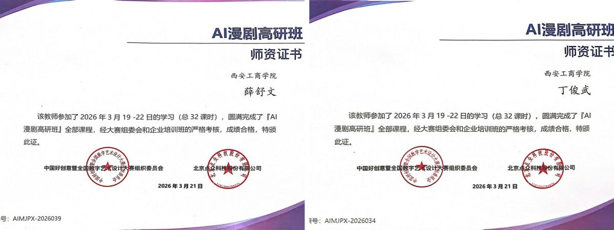 3月19日至22日,在西安工商学院新视界产业学院的组织下,人文学院广告设计系教师薛舒文与艺传学院影视摄影与制作系教师丁俊武赴西安邮电大学,参加由中国好创意暨全国数字艺术设计大赛组委会、西安微短剧产业研究院联合主办的《中国好创意AI漫剧》高级师资研修班,本次研修班聚焦AI漫剧技术应用与教学转化核心主题,汇聚上海戏剧学院、中央戏剧学院、西安邮电大学等高校资深教授及点众科技行业实战专家,通过理论讲解、案例剖析、实操演练等多元化形式,为培训教师系统讲解AI漫剧创作逻辑、核心技术革新、教学落地方法等内容。旨在通过行业顶尖导师的引领,提升教师的数字艺术教学实践能力。